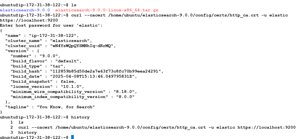 ubuntu@ip-172-31-38-122:~$ curl –cacert /home/ubuntu/elasticsearch-9.0.0/config/certs/http_ca.crt -u elastic https://localhost:9200