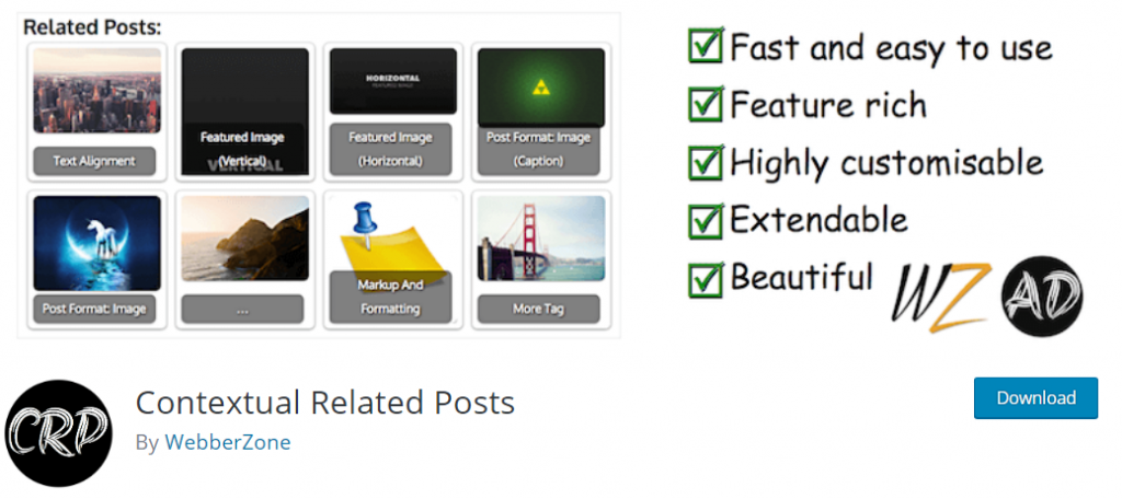 Contextual Related Posts is the best plugin for WordPress that gives you to display a list of related posts on your website and in your feed. It supports for thumbnails, shortcodes, widgets, custom post types, and CSS styles.