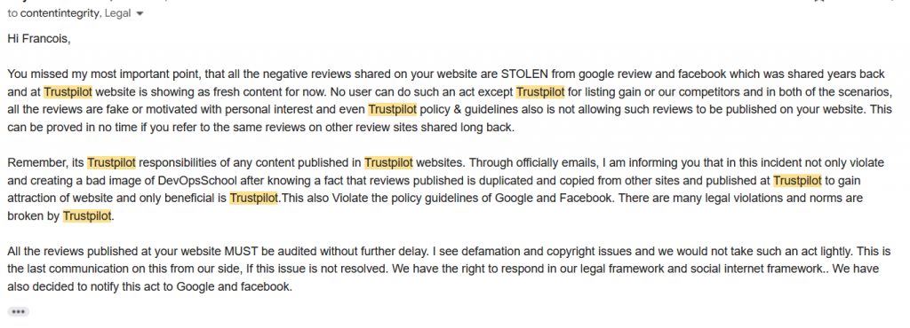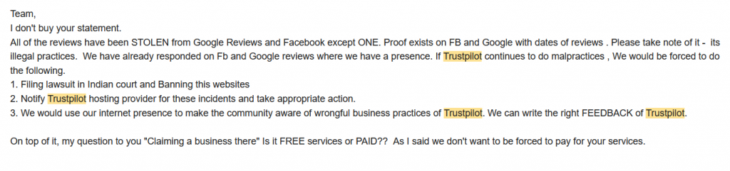 When I googled more about this company, I learnt that their Google RATING is 1.5 out 5 in their own home country. They are so scared to receive feedback about them, that they have disabled the youtube comment sections as well. I reviewed their Glassdoor reviews from employees and I was shocked that engineers also shared the same opinion that Trustpilot is not having any ethics and value to be in Company review domain. I refer to quora as well and i was shocked that paid review is being sold at Trustpilot by their own setup and employee. On top of being a review company of the business, they are offering paid services to businesses putting all moral values on the stack.