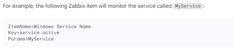 To do this, you can create a Zabbix item that monitors the service using the service.active item key. In the Params field, specify the name of the service that you want to monitor.
