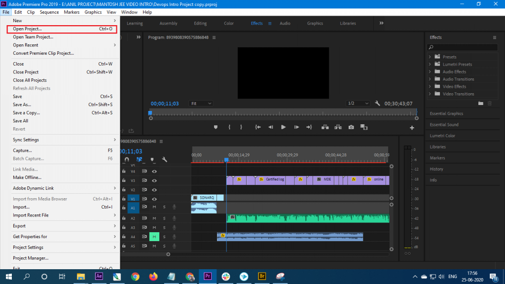 - Choose File > Open Project. ( Shortcut key :- Windows: Ctrl+O)