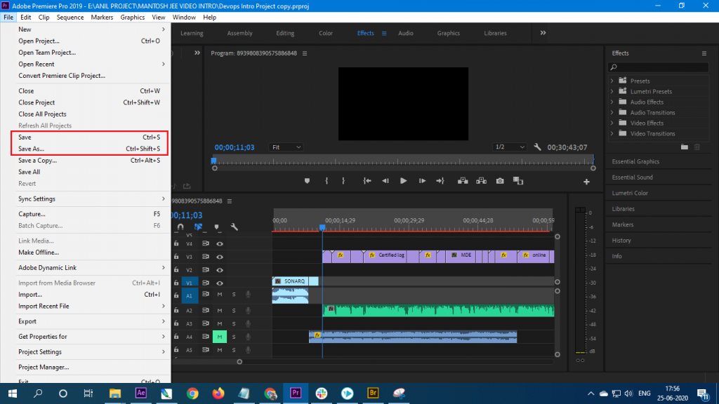 As soon as you work on a project and want to keep it safe, then you have to save your file. By saving, your file will be safe. When you close a project, save the workspace to it, but remove the project panel and the timeline panel before closing the work.