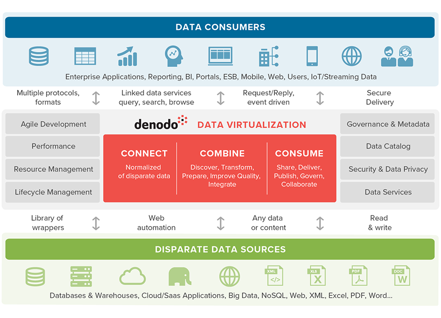 - Optimization Layer: Denodo’s optimization layer handles query optimization, caching, and pushdown optimization for better performance.