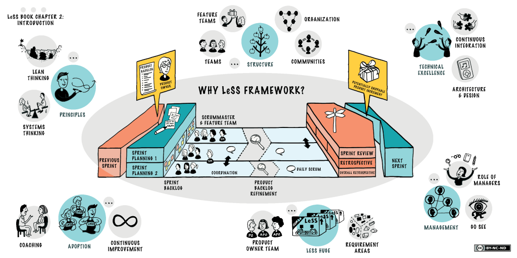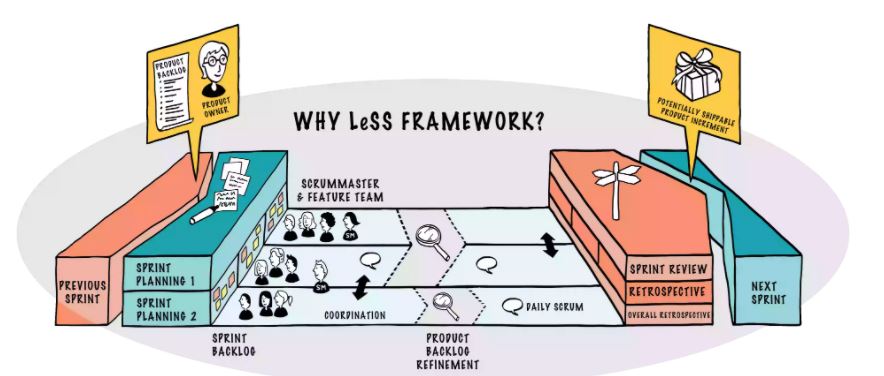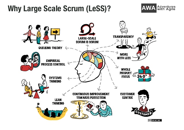 Large-Scale Scrum ( LeSS ) is a way of scaling agile and scaling scrum to large and big product development groups. It has been used since 2005 in different software and hardware products in industries such as banking and telecom.