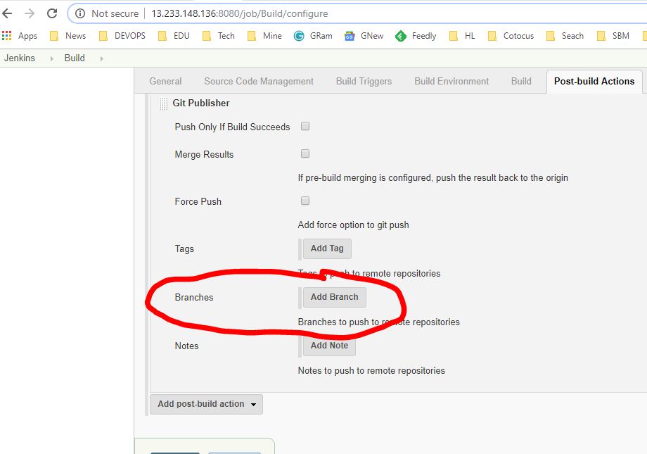 Step 2 – Go to “Post-build Actions” and from “Add post-build action” list, select “Git publisher” and under “Branches” section craete a new branch. Please refer the attached image.