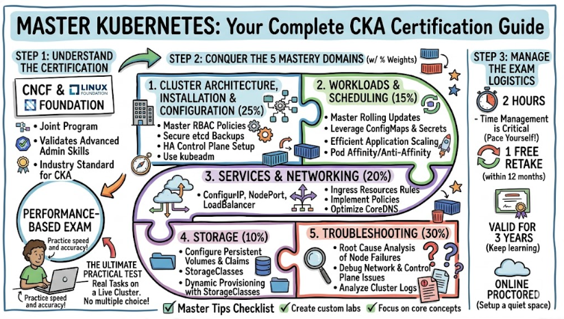 - 30 Days Plan (The Dedicated Study): This is for working engineers who use containers but are relatively new to Kubernetes operations. Week 1-2: Architecture and core objects. Week 3: Storage and Security (RBAC). Week 4: Troubleshooting and mock exams.