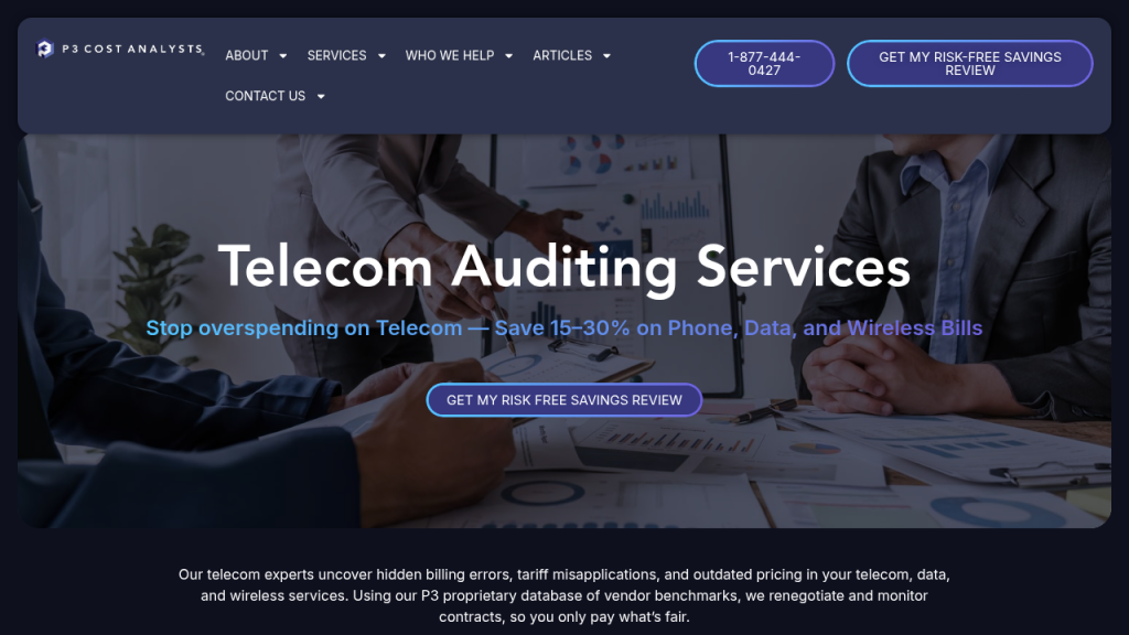 P3 Cost Analysts is a professional telecom audit firm that operates on a contingency fee model — clients pay only from confirmed savings, eliminating upfront cost and financial risk. The firm’s process involves forensic-level invoice review, benchmarking against a proprietary carrier rate database, validation of contract tariff compliance, and direct carrier negotiation to recover overbillings. Clients typically recover 15–30% of total telecom spend.