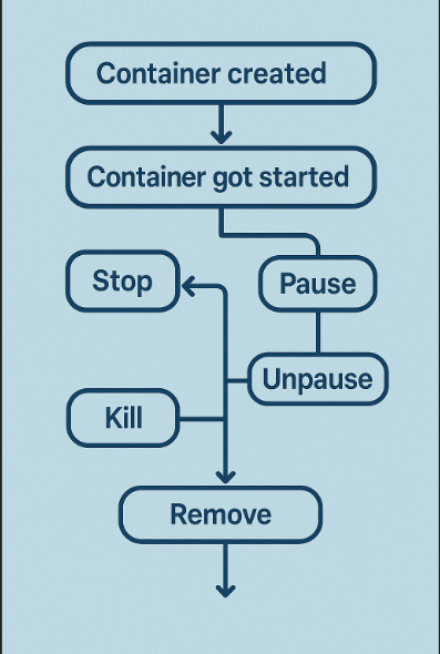 Ashwani Container Lifecycle is like the journey of an app form born to die Container created Container got started If User want to Stop then Stop. Then Again for using that container we should start or restart the container If we want any container to Pause then Pause Same if we want to resume the container services then Unpause. If we want to kill any Container then Use Kill And after that we can remove that container