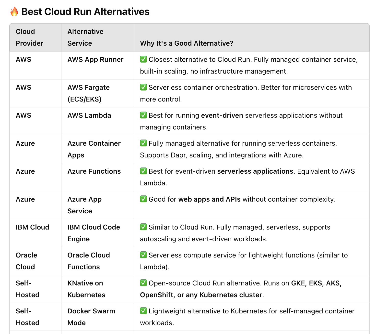 | IBM Cloud | IBM Cloud Code Engine | ✅ Similar to Cloud Run. Fully managed, serverless, supports autoscaling and event-driven workloads. |